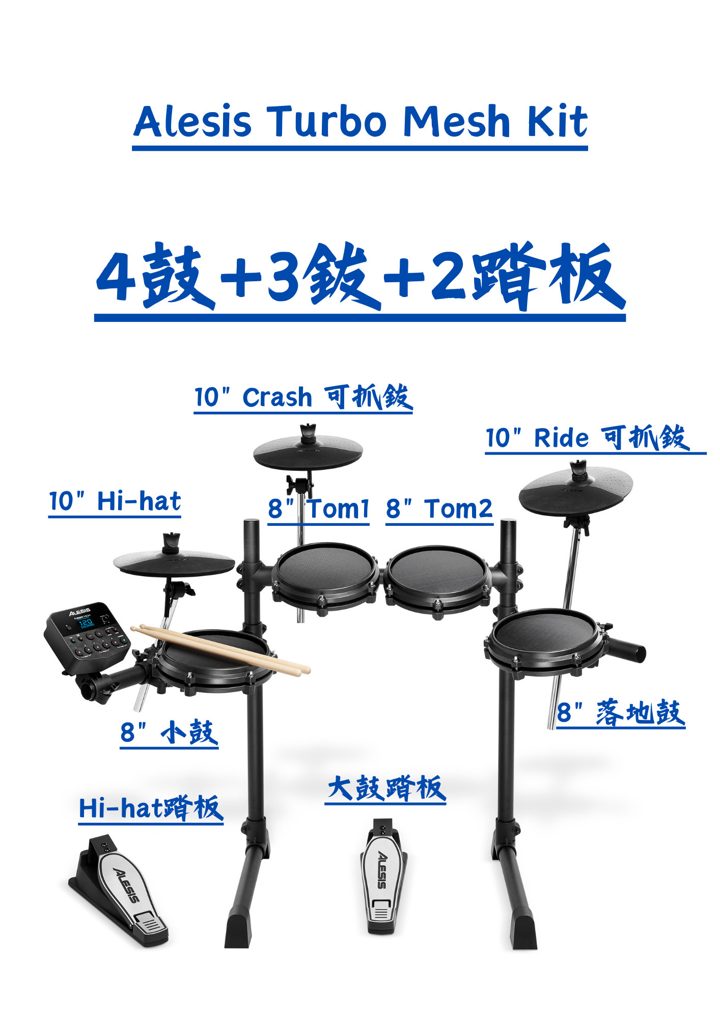 Alesis Turbo Mesh Kit是一套完整的7件式電子鼓套件,以新一代Alesis網狀鼓技術為核心,全網狀的鼓面給鼓手等同於傳統鼓皮的自然手感反饋和超靜音響應,在演奏電子鼓時是鼓手最高cp值選擇。Turbo 具有8英吋網狀小鼓、三個8吋網狀中鼓、3個10吋鈸、定制設計的Alesis hi-hat踏板、大鼓踏板及耐用的金屬製鼓架,另外還提供音源線、鼓棒、電源線和鼓鎖工具,您可以立即開始您的演奏!