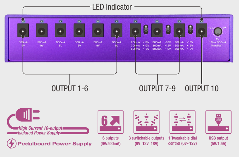 直流輸出:9V/500mA*6組,9V/12V/18V可調*3組,6V~12V可調度*1組,USB 5V/1.5A用於平板